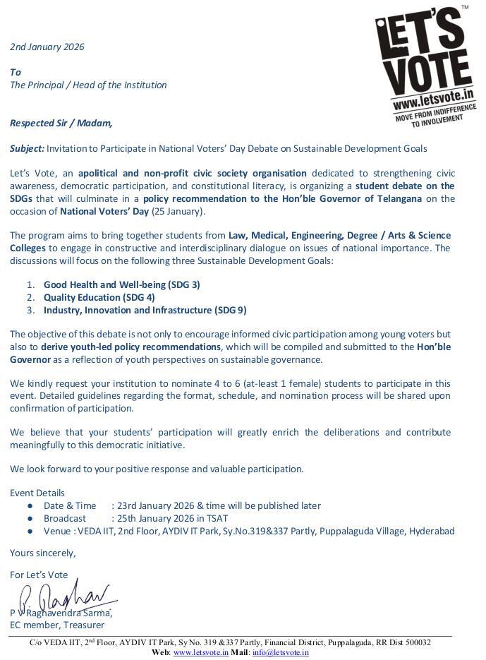 Let’sVote Invitation to Participate in National Voters’ Day Debate on Sustainable Development Goals on 23 Jan 2026, 10:30AM; Join us at VEDA IIT, Hyderabad.